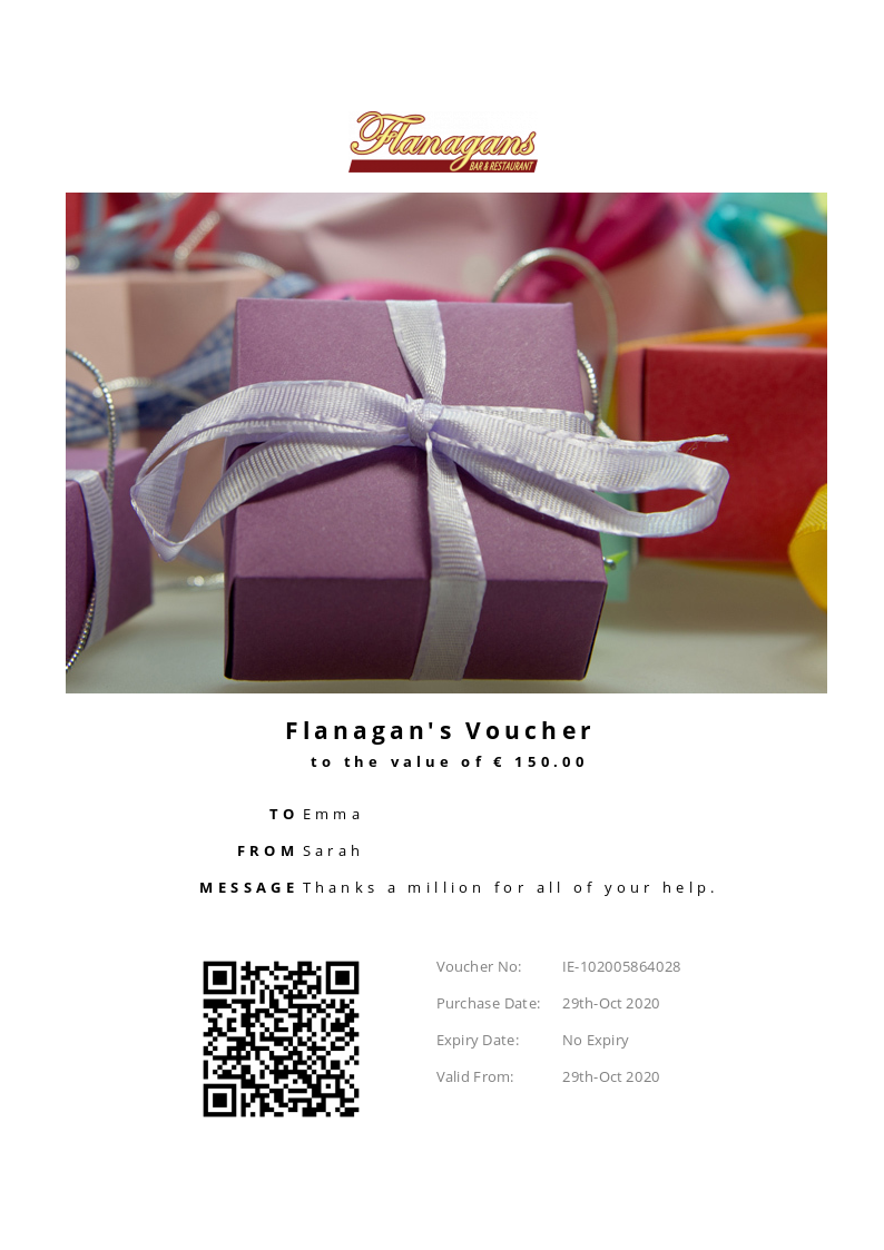 Flanagan's allows you to purchase instantly printable gift vouchers, special offers and tickets using the Voucher Connect platform.